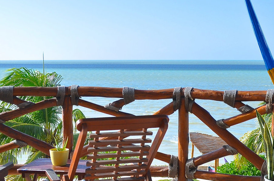 Con una de las mejores vistas del mar de la isla, tienes que subir al cuarto de juegos en el techo encima de la recepción – te ofrece el lugar ideal para tomar una foto del mar tranquilo de Holbox con las hamacas dentro del mar famosas de Villas Flamingos en primer plano.